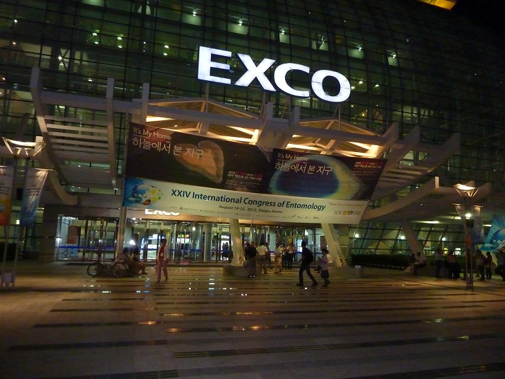 For a first real report from the Stireman lab, I thought I might say a few words about my recent trip to South Korea to attend the XXIV International Congress of Entomology. This meeting, my first ICE actually, was held at the EXCO convention center in the city of Daegu, which is located in Southwest S. Korea. I cannot begin to describe the diversity of interesting talks and posters. There were many concurrent sessions covering everything from genomics to biogeography. A few of the general oral sessions were eclectic assemblages such as, my favorite title, “Ecology: Genetics, pollution, symbionts & prey-predator interaction.”