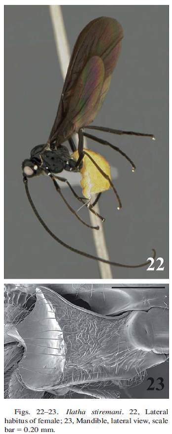 Some of the specimens that Kula et al. used in their species descriptions were reared as part of our collaborative NSF Biological Surveys and Inventories project focused on Caterpillars and Parasitoids of the Eastern Andes(on which Scott Shaw is a Principal Investigator). For attempting to identify some of the tachinid hosts of Ilatha from puparia, the authors honored me by naming one species (right) Ilatha stiremani. I am truly honored to have such an interesting and beautiful (at least in my eyes) wasp bear my name – even if it is a mortal enemy of my tachinid brethren. Thanks Guys!